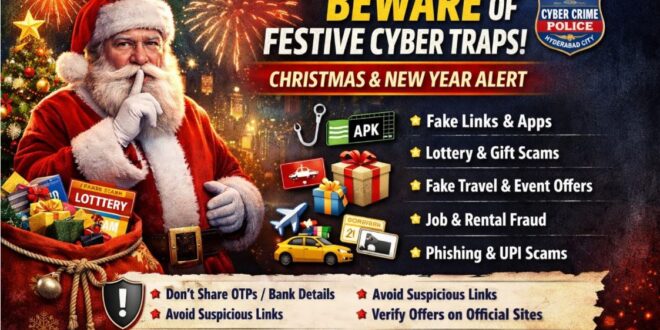 In a statement issued by V. Aravind Babu, IPS, Deputy Commissioner of Police, Cyber Crimes, Hyderabad City, the Cyber Crime Police have cautioned citizens to remain extra vigilant during the Christmas and New Year season, as cyber fraudsters intensify their activities by exploiting festive offers and the surge in online transactions.