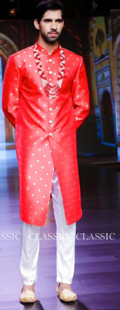 Traditionally, Banarasi Silk was used, but the sartorial choices have evolved over time to include materials like jamdani, net, tissue for greater accessibility and affordability. Many of the pieces featured zardozi work, brocade panels and regality-inspired detailing. The men’s collection, slightly adapted to contemporary sensibilities, comprising jamawar sherwanis, achkans and choghas, drew on Persian-influenced motifs and older tailoring methods that once defined formal attire in the Deccan.